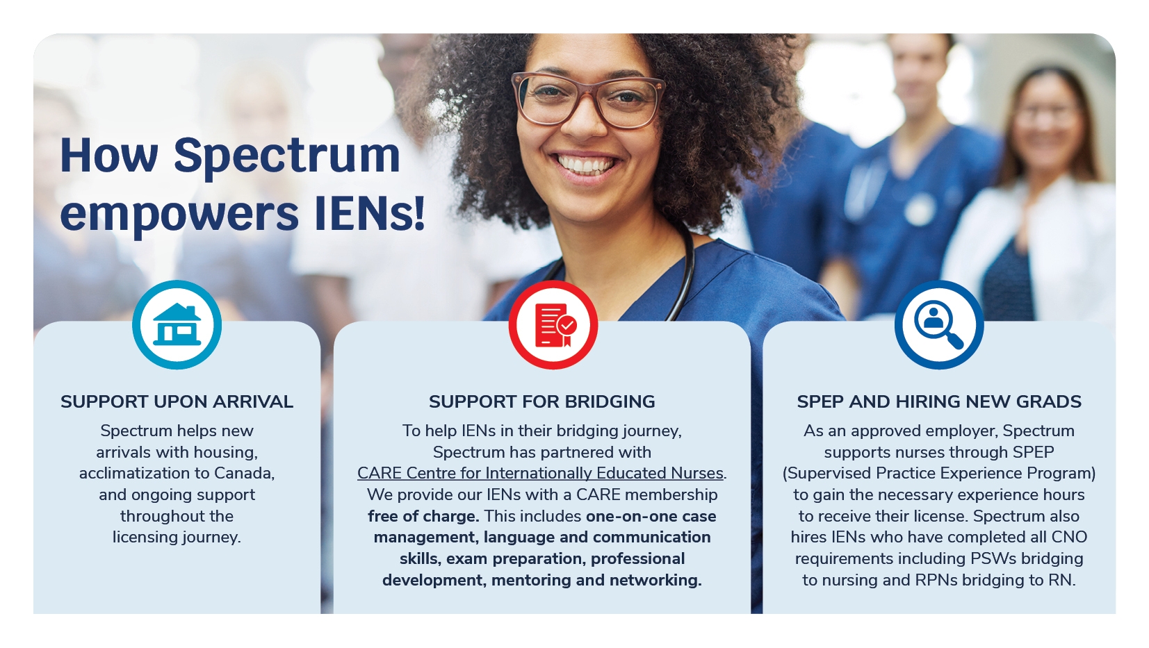 To help IENs in their bridging journey, Spectrum has partnered with CARE Centre for Internationally Educated Nurses. We are providing our IEN employees with a CARE membership free of charge.