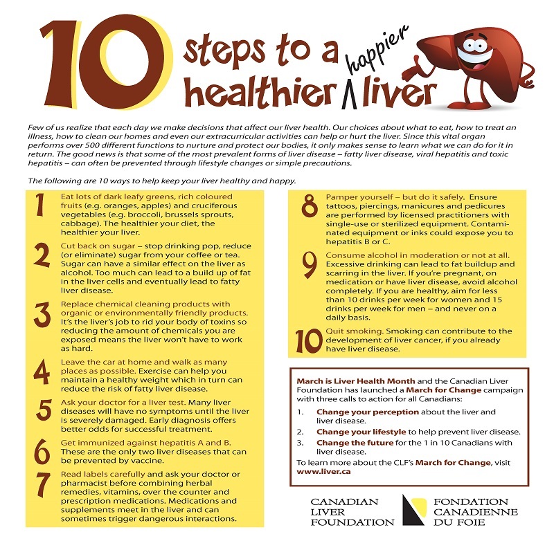 The Canadian Liver Foundation's (CLF) second call to action is to change your lifestyle to help prevent liver disease. CLF created the "10 steps to a healthier and happier life." We challenge you to pick 2 things that you can do this week to take better care of your liver!